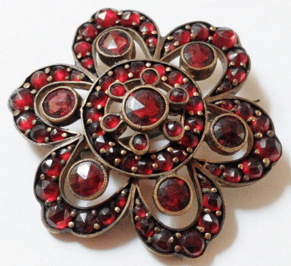 Antique Pyrope Garnet Flower Pin, Lovely Deep Red Stones – $200