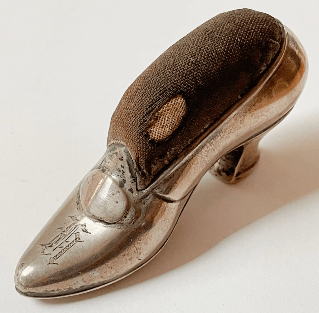 1907 Gorham Sterling Silver Shoe Pincushion, Engraved – $175