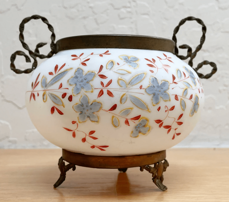 Antique French Opaline Footed Bowl/Pot, Hand-Painted Flowers, Metal Feet and Handles – $175