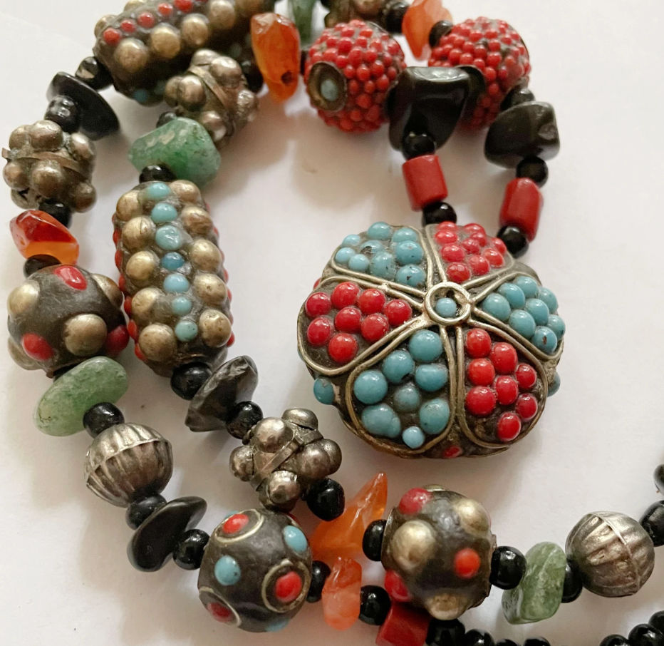 Old Tibetan Nepal Necklace with Stone Chips, Glass Turquoise, Coral Beads – $85